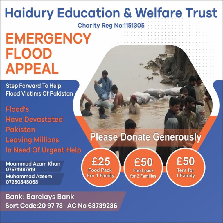 Haidury Education & Welfare Trust have teamed up with a local charity in Pakistan who are working on the ground providing life saving vital aid to the flood victims across Pakistan.